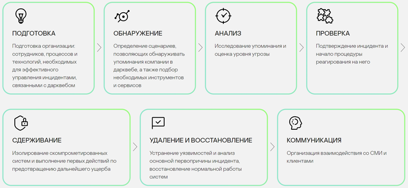 В разработанном руководстве можно увидеть варианты построения систем мониторинга ресурса дарквеба, чтобы иметь актуальную информацию по утерянным данным и оперативному реагированию появившихся инцидентов. Кроме того, предлагаются рекомендации по взаимодействию со средствами массовой информации, оповещению клиентов и партнёров об утечке, а также других заинтересованных лиц. В большинстве организаций не могут построить правильную систему противодействия появившемуся инциденту и быстро отреагировать на возможный ущерб и понижению репутации компании. Поэтому «Лаборатория Касперского» предлагает руководство по созданию процессов реагирования на утечки и появившиеся инциденты.