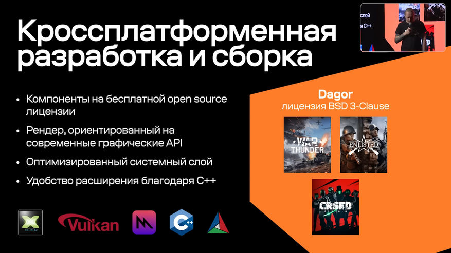 Но у движка Dagor есть и преимущество: набор поддерживаемых API. В списке поддерживаемых API, помимо DirectX 11, который широко распространён в играх для Windows, имеется Vulkan. А вот это уже означает поддержку кроссплатформенности, про которую говорили разработчики. Vulkan может работать на компьютерах с установленными Linux, а также на родственных к ней системах: Android и iOS. Но поддержка Linux в Vulkan не означает что игры будут на нём запускаться, необходимо адаптировать инструментарий с учётом поддерживаемых библиотек и особенностей данной системы. Так что вопрос к разработчикам VK, смогут ли они адаптировать создаваемый инструментарий и компилятор для linux подобных систем.