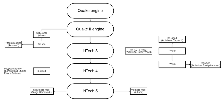 Тут не перечисляются игры, а также не упоминаются промежуточные итерации, которые не стали основополагающими для других движков. И это только задокументированные ответвления переросшие в крупные игровые движки сторонних студий, некоторые студии могли брать различные части движка или идеи для последующей реализации в своих проприетарных движках. Так же не стоит забывать первое время движок id Software был open source, до idTech5 был доступен для лицензирования, а вот после он стал доступен только студиям входящим в родительский холдинг Bethesda — Zenimax. Но даже так, из движка Кармака выросли движки Valve, Activision и Respawn, и множество более мелких ответвлений.