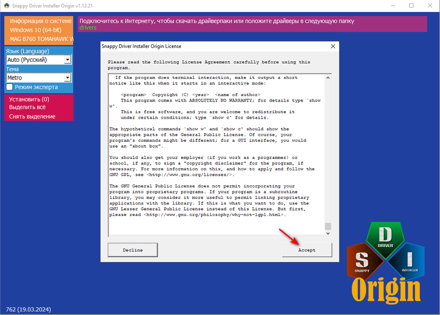 3. Запускаем от имени администратора файл SDIO_x64_актуальная_версия.exe. Если всё прошло успешно, то перед вашим взором появится интерфейс ПО. Принимаем условия лицензионного соглашения.