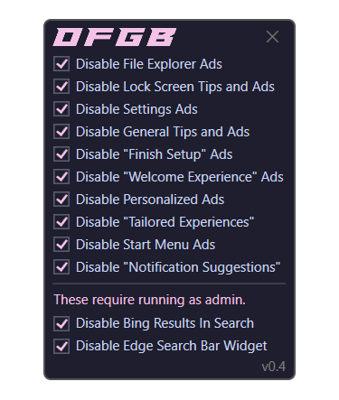 Программа носит название OFGB (Oh Frick Go Back), написана на языке программирования C# и использует каталог заранее записанных значений параметров реестра для отключения рекламы. Как заявляет её автор, всего за несколько кликов OFGB способна отключить рекламу в меню «Пуск», проводнике, настройках и в других местах Windows 11.