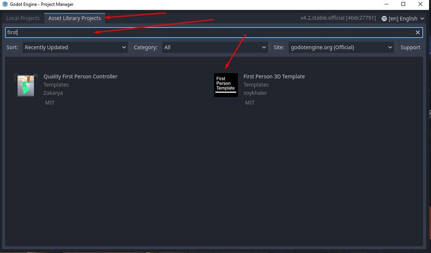 Запускаем Godot, переходим в библиотеку ассетов, находим First Person 3D Template, смело качаем. Предупреждения о том, что объект создавался в движке версии 4.1 смело игнорируем. Уже можем запустить игровую сцену с видом от первого лица, не написав ни одной строки кода.