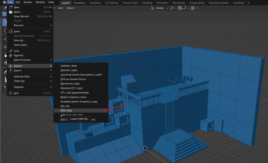 Распаковываем набор ассетов, видим что файлы в формате .fbx, видимо, для Unity. Запускаем Blender и ипортируем файлы. В целом можем импортировать и уже готовый объект Sample 2, собранный из модулей в наборе. Затем можем просто сохранить в формате. blend файла.