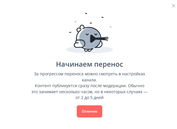 Сообщается, что автор канала сможет переносить до 2 тысяч видео файлов за раз. Но время копирования будет зависеть от выбранного количества роликов и качества видеозаписи. В зависимости от объема видеоконтента перенос может занять от нескольких часов до 5 дней. Во время переноса будет проходить модерация площадки Rutube, которая будет отсеивать видеоролики, нарушающие законы России.