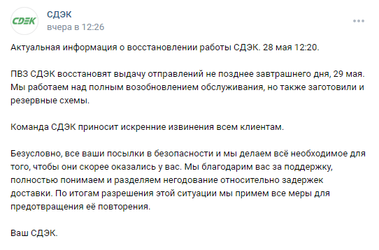 Вот уже четвёртые сутки, как транспортная компания СДЭК прекратила свою деятельность. Нет никакой информации о том, когда точно сервис доставки заработает в обычном режиме. Согласно предварительной информации, опубликованной на официальной странице в социальной сети «ВКонтакте», пункты выдачи заказов начнут работу не позднее 29 мая.
