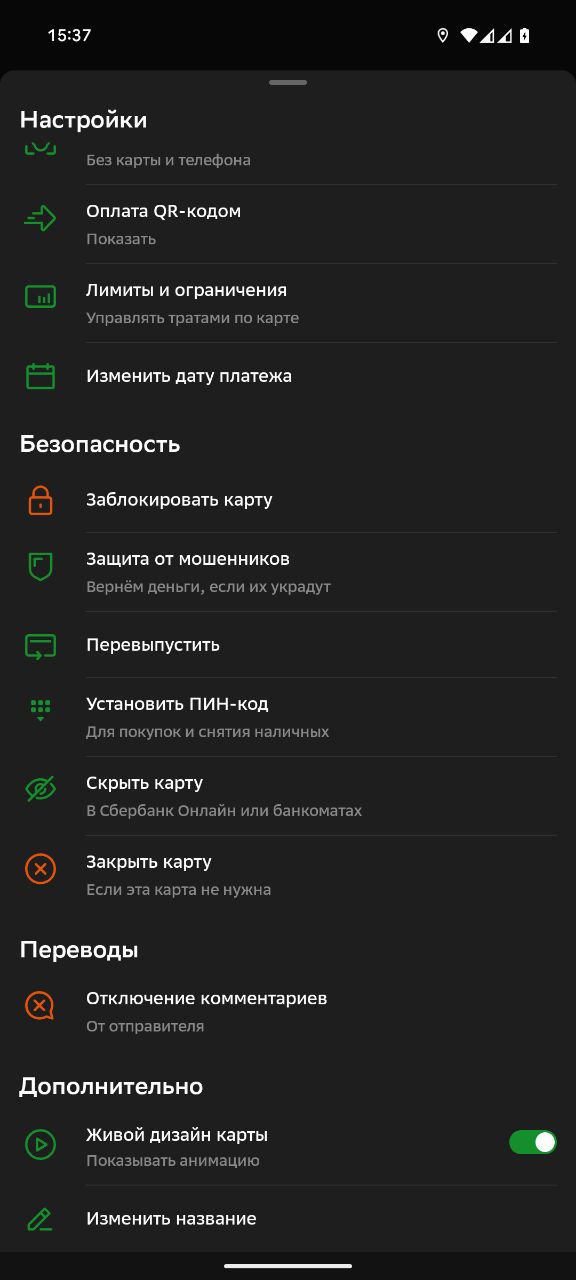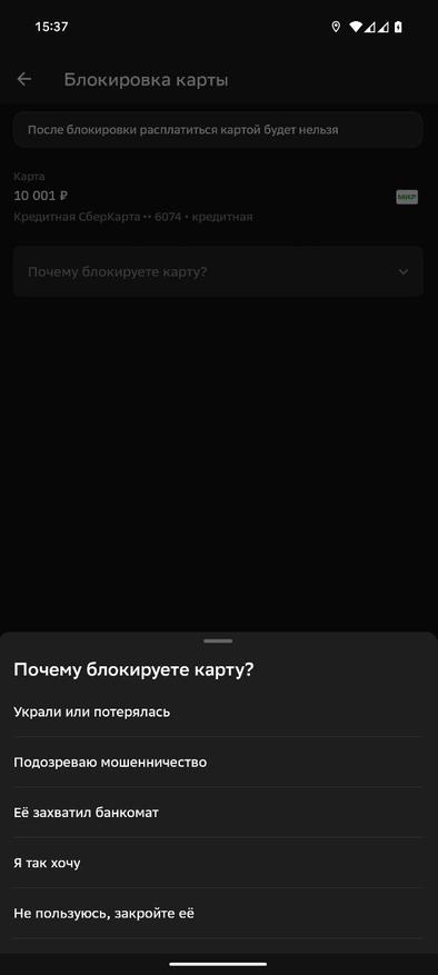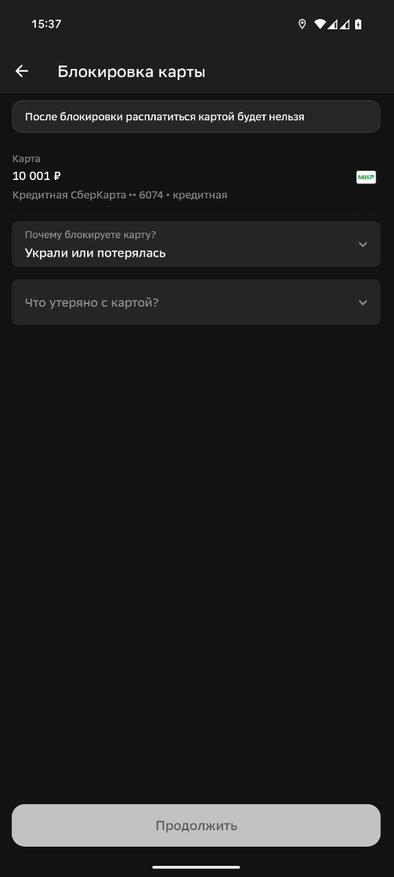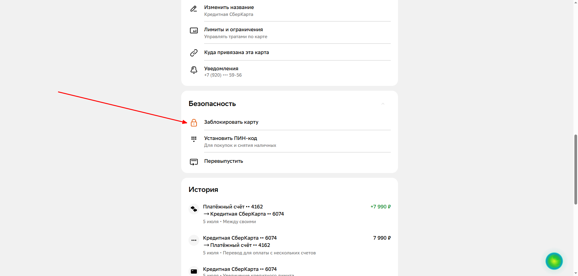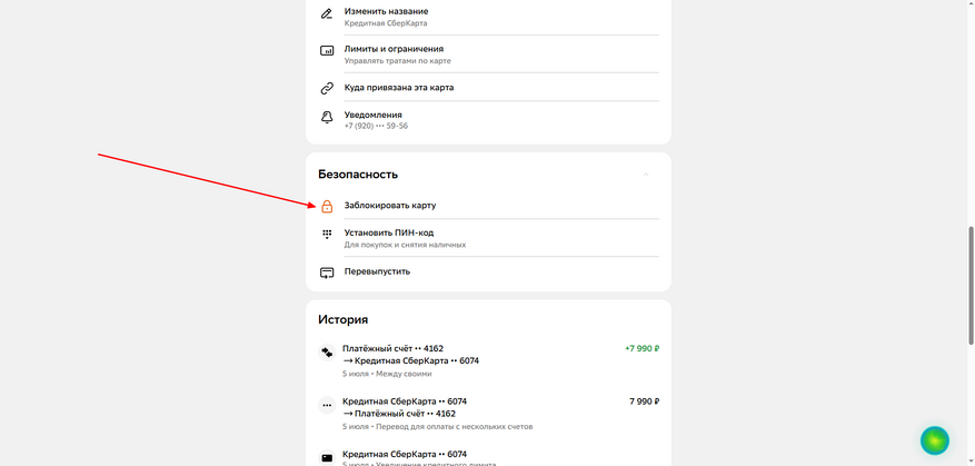 2. Откройте настройки карты и перейдите в раздел «Безопасность» и нажмите «Заблокировать карту»