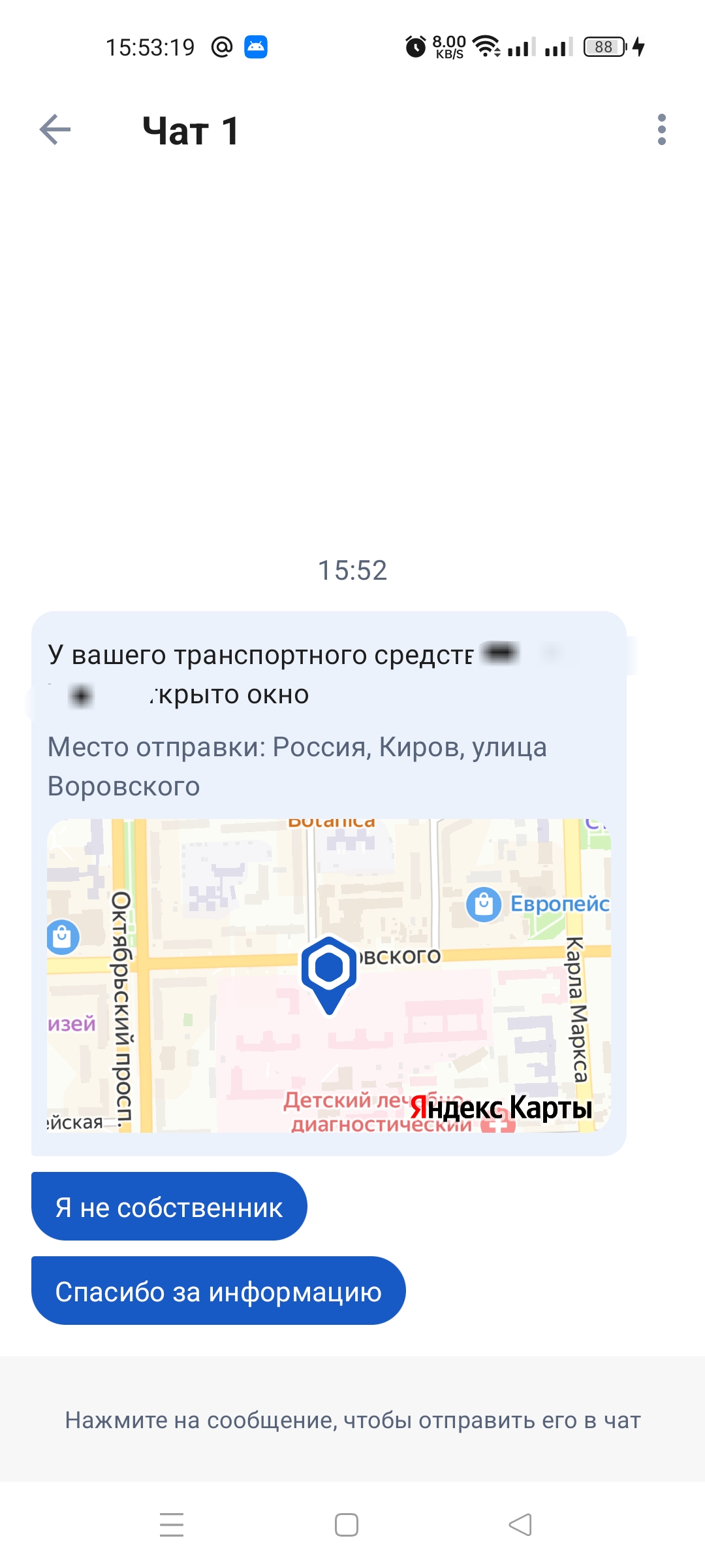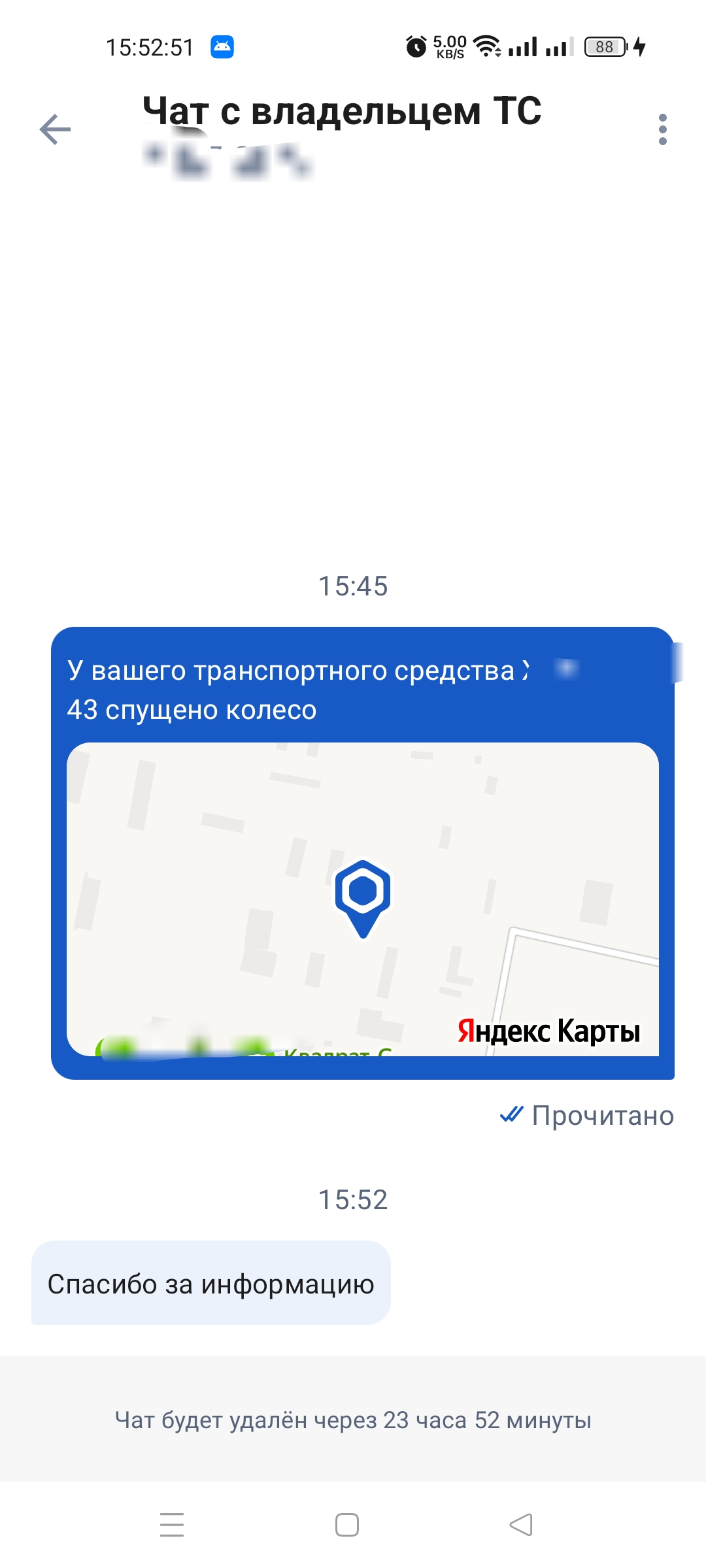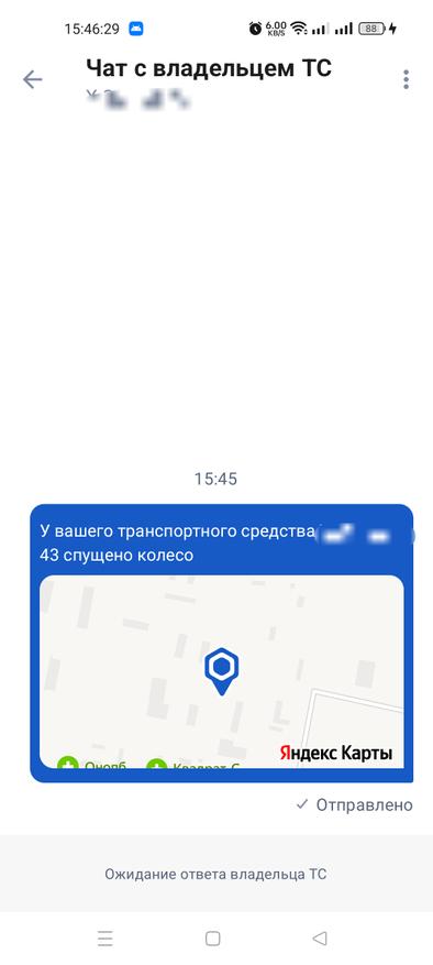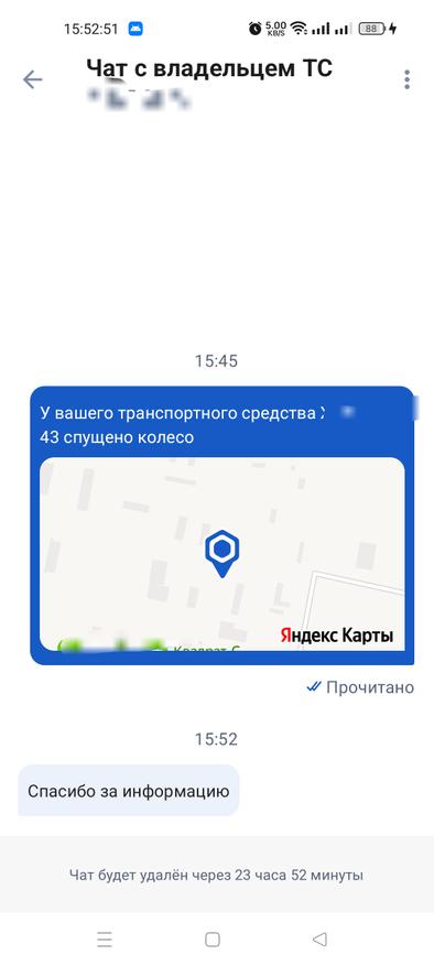 На экране отобразится Яндекс. карта, где можно будет увидеть месторасположение транспортного средства. Сообщается, что вся переписка будет храниться не более 24 часов и автоматически исчезнет.