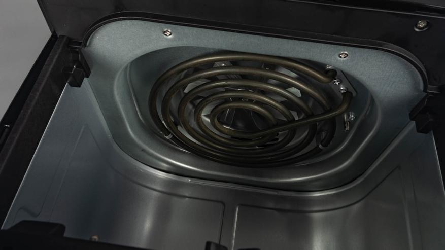 Внутри аэрогриля над чашей находится алюминиевая панель, закрывающая нагревательные элементы. В основе функционирования аэрогриля лежит конвекционный принцип, схожий с работой духового шкафа: горячий воздух активно перемещается внутри камеры. Такая циркуляция способствует равномерной тепловой обработке продуктов.