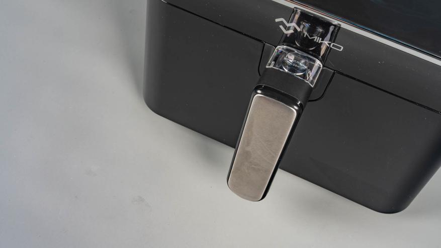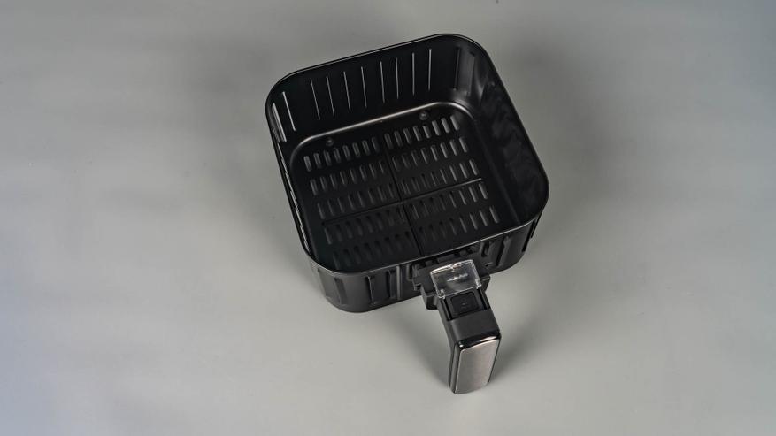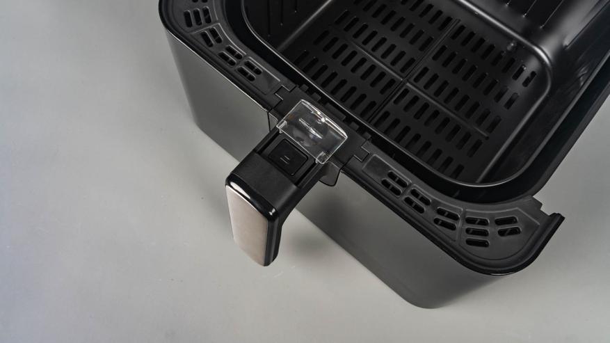 На передней панели расположена сенсорная панель для управления аэрогрилем и ручка, соединенная с выдвижной чашей. Сама чаша выполнена из металла с антипригарным покрытием и оснащена крупной пластиковой ручкой, гармонирующей по цвету с корпусом. Эта ручка обеспечивает удобную установку и извлечение чаши из устройства.