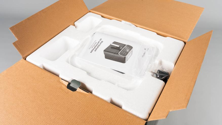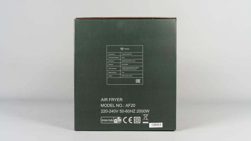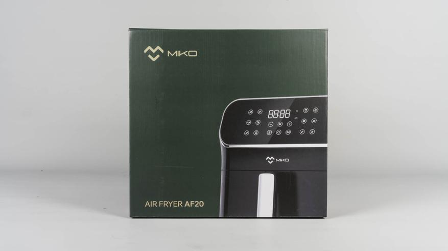 MIKO AF20 поставляется в картонной коробке с изображением аэрогриля и списком его основных характеристик.