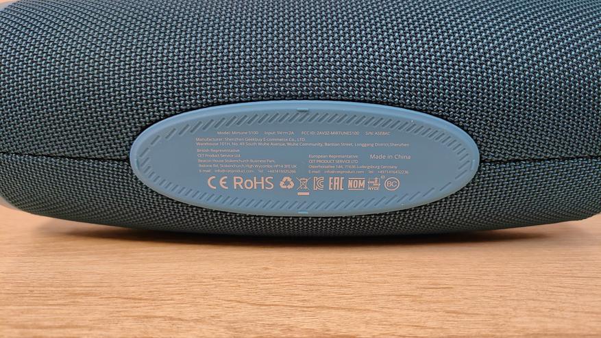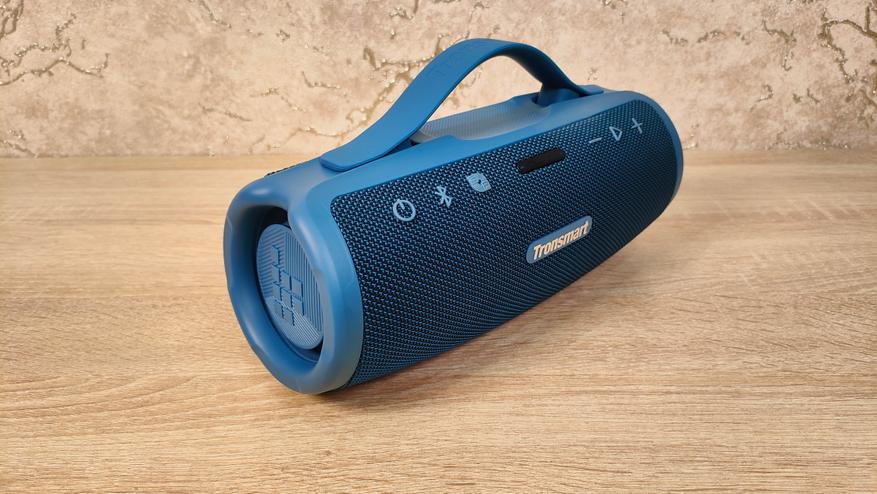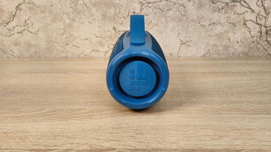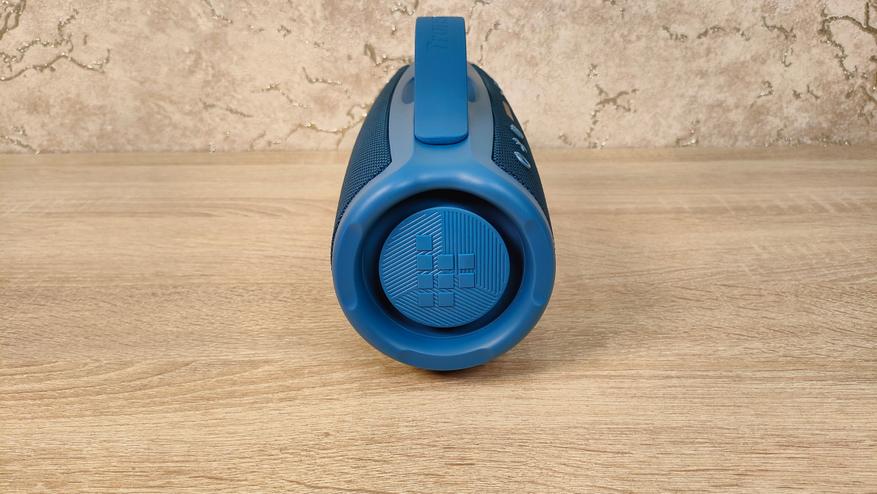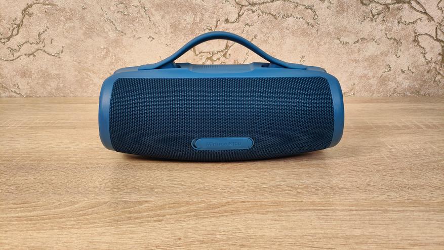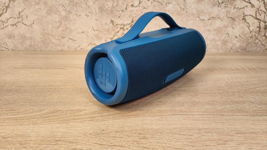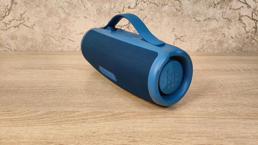 Акустика имеет, можно сказать, классический вид некоего раздутого цилиндра с ручкой. Сейчас подобный внешний вид используется у многих брендов, он не перегруженный и вполне неплохо смотрится. Цветовые решения бывают совершенно разные, в данном случае, это синий цвет. На передней панели сосредоточены органы управления, которые в принципе понятны без объяснений, по своему внешнему виду, между двумя блоками управления есть вставка со светодиодной индикацией, где отмечено состояние и состояние заряда. Слева и справа расположены пассивные излучатели, сзади есть силиконовая заглушка с нанесённым на ней моделью, за которой скрывается порт зарядки Type-C, порт USB Type-A для подключения флешек, картовод для MicroSD карт. На дне находится овальная силиконовая ножка с информацией.