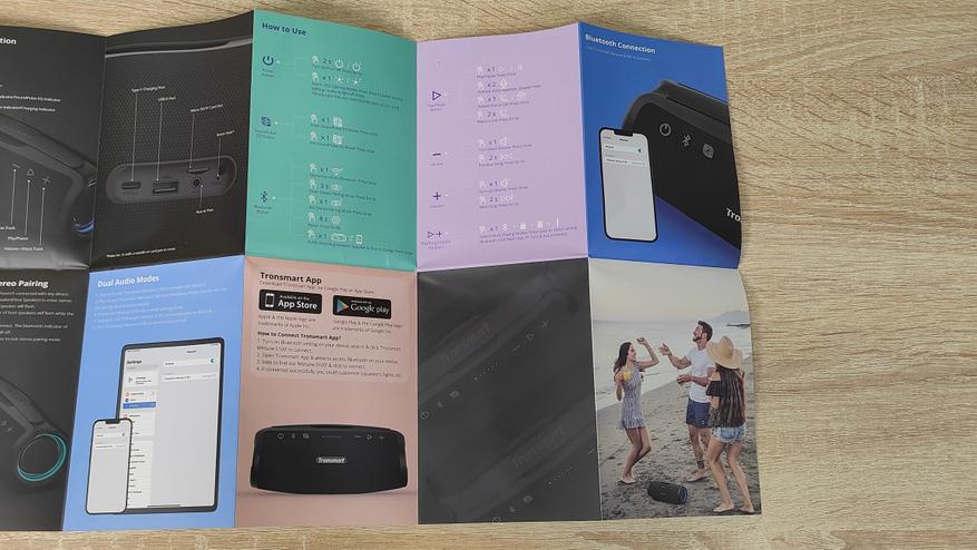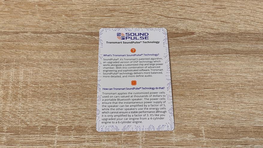 На коробке есть различная информация о способностях данной акустики, например, объединение в стереопару, защита IPX7, подсветка, а также время работы, равное 20 часам. Комплект поставки следующий: колонка, кабель для подключения и зарядки, руководство пользователя, гарантийный талон, а также вкладыш про фирменную технологию Sound Pulse.