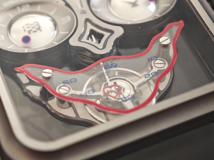 Время на часах отображается в формате: часы-минуты-секунды. По сложившейся традиции: часовой циферблат — левый глаз персонажа, минутный — правый. А вот усложнение секундного циферблата здесь нетипично и оригинально, потому что траектория, которую описывает секундная стрелка, — не круг.