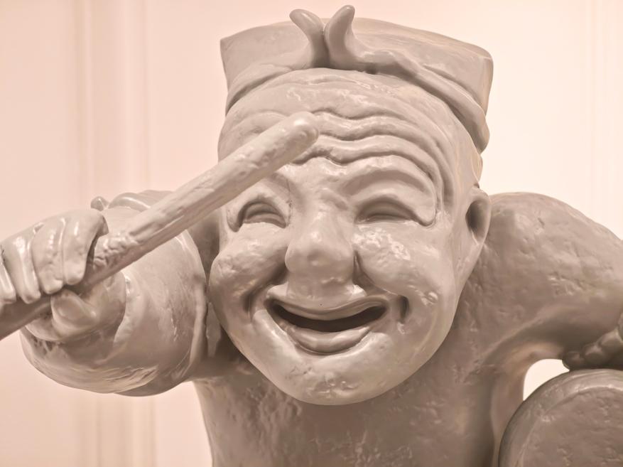 Портретные черты часы позаимствовали у веселого китайского сказочника, бьющего в барабан, фигурка которого разместилась на стойке внутри бутика.