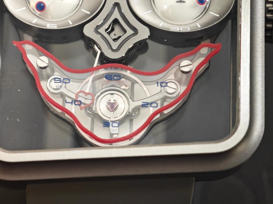 Секунды от 10 до 50 разместились на «улыбке» часов, так что стрелке приходится двигаться тут то вперед, то назад, и она то выдвигается, то задвигается обратно внутрь калибра. Центральная часть улыбки — открытый баланс, в динамике которого хочется видеть язык болтливого сказочника.