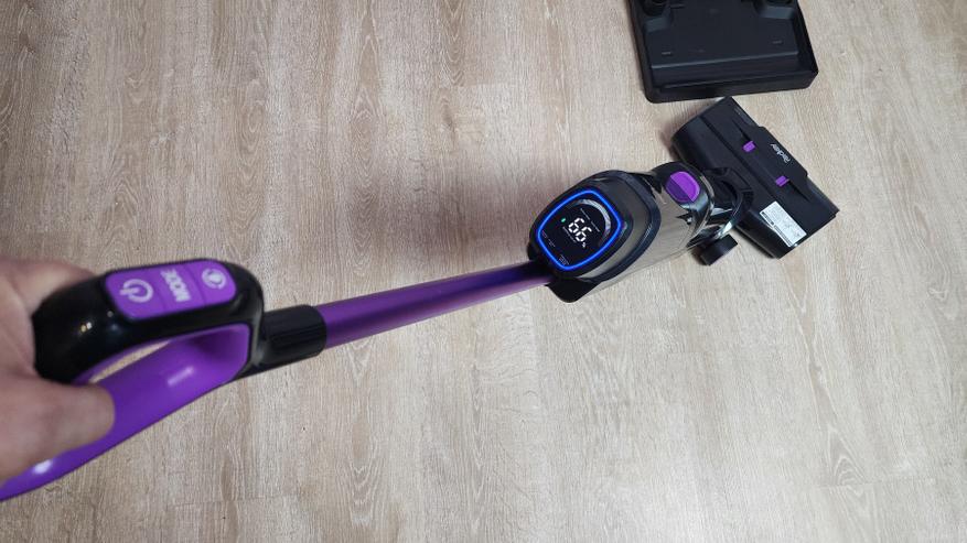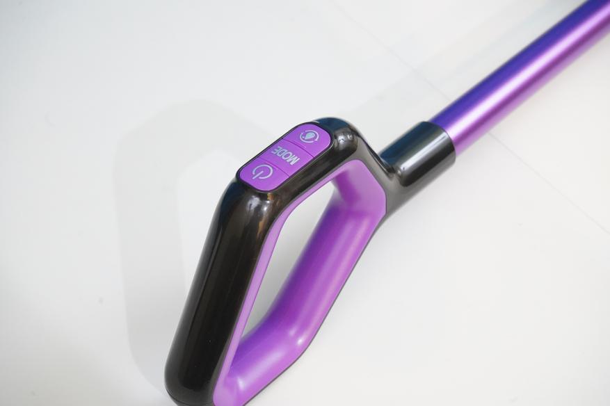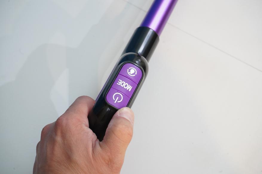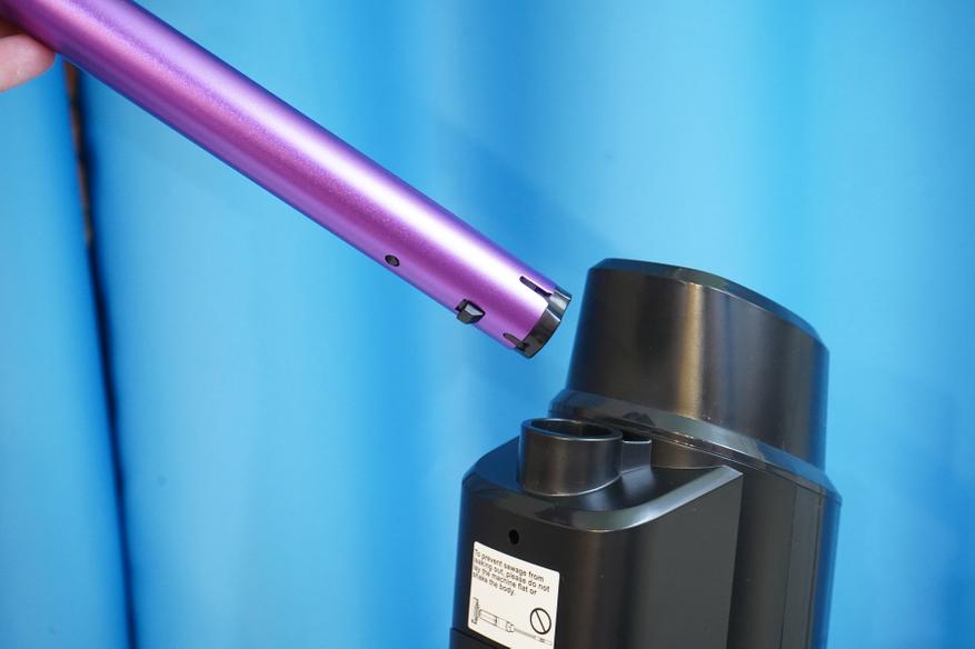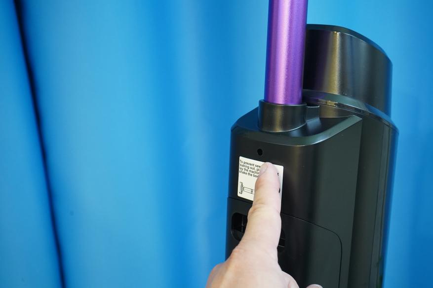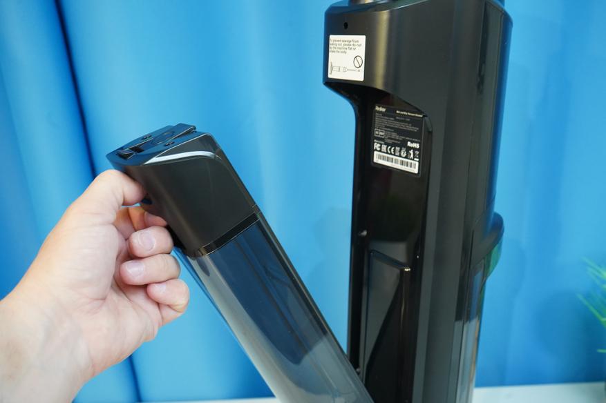 Перед первым использованием нужно соединить ручку с основным корпусом до характерного щелчка. В самой ручке предусмотрено четыре электрических контакта, обеспечивающих работу кнопочной панели. Если возникнут сложности — поможет иллюстрированная инструкция из комплекта. Разобрать пылесос также просто: достаточно нажать на фиксатор сзади.