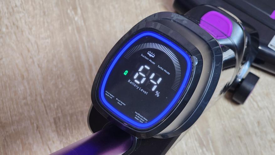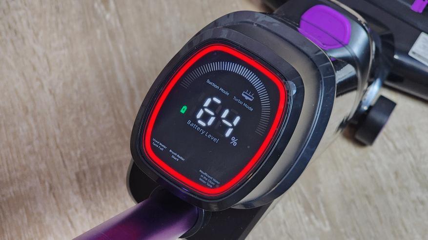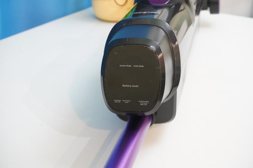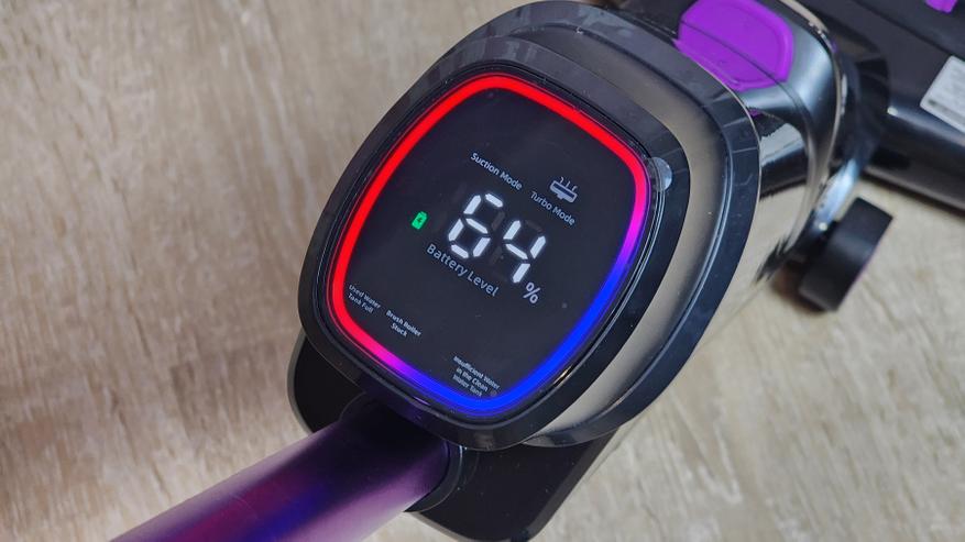 Достаточно оригинально реализован кольцевой индикатор пылесоса. Цветами и их комбинацией показывает уровень загрязнения пола. Одновременно с индикацией регулируется и сила всасывания: красный — максимальный уровень. Также присутствуют индикаторы статусов, уровень заряда батареи в процентах, возможные ошибки и так далее.
