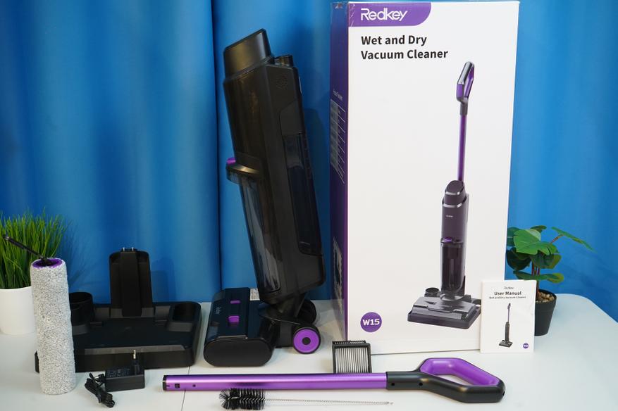 Жена устала от постоянного мытья полов шваброй и попросила найти удобную альтернативу. Основные требования: небольшой вес и простота использования, манёвренность, работа без проводов (аккумуляторный), влажная уборка и самоочистка. После изучения рынка остановились на новой модели от Redkey — недорогом, но функциональном моющем пылесосе Redkey W15, который справляется и с пылью, и с загрязнениями, и не требует предварительной сухой уборки. В коробке находился сам пылесос (со снятой ручкой), запасной мягкий ролик, база-подставка, блок питания, ёршик для очистки, запасной HEPA-13 фильтр. Есть и инструкция пользователя на русском языке.