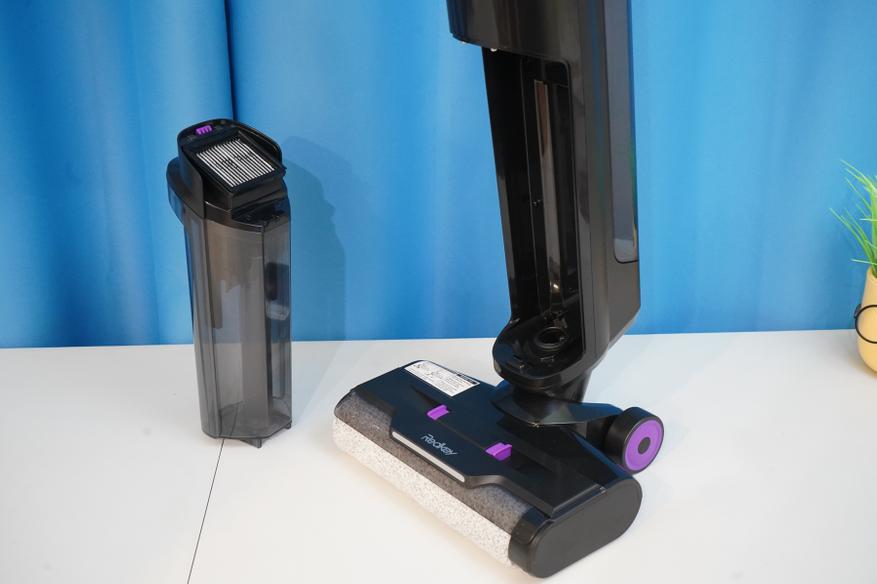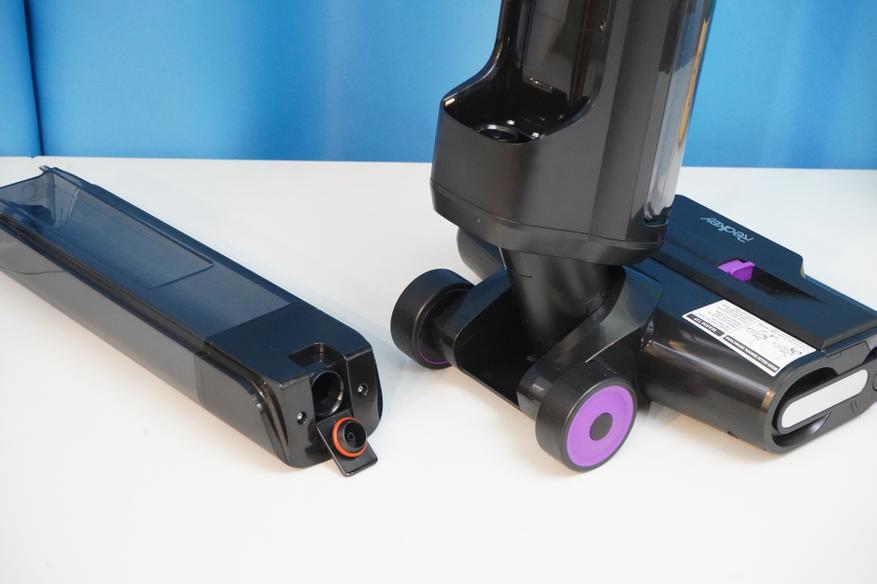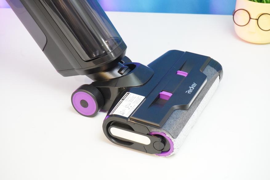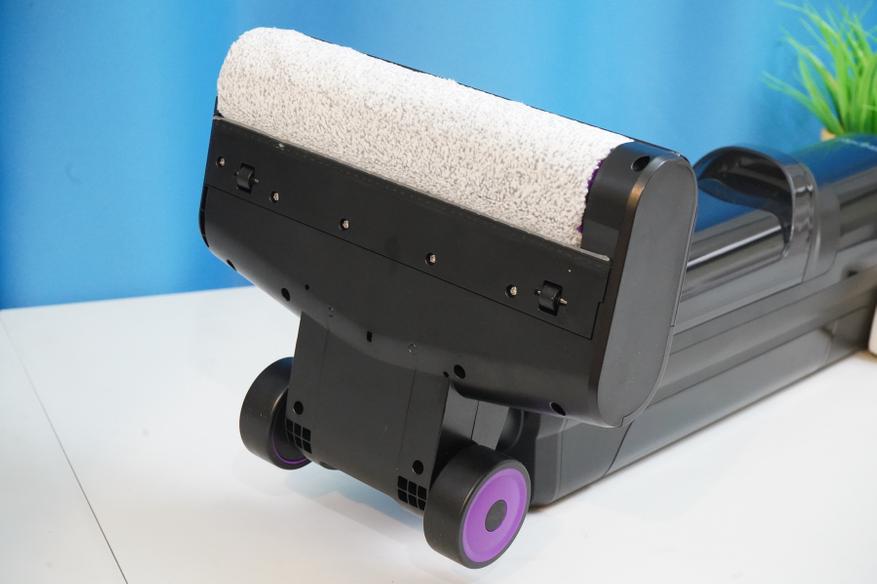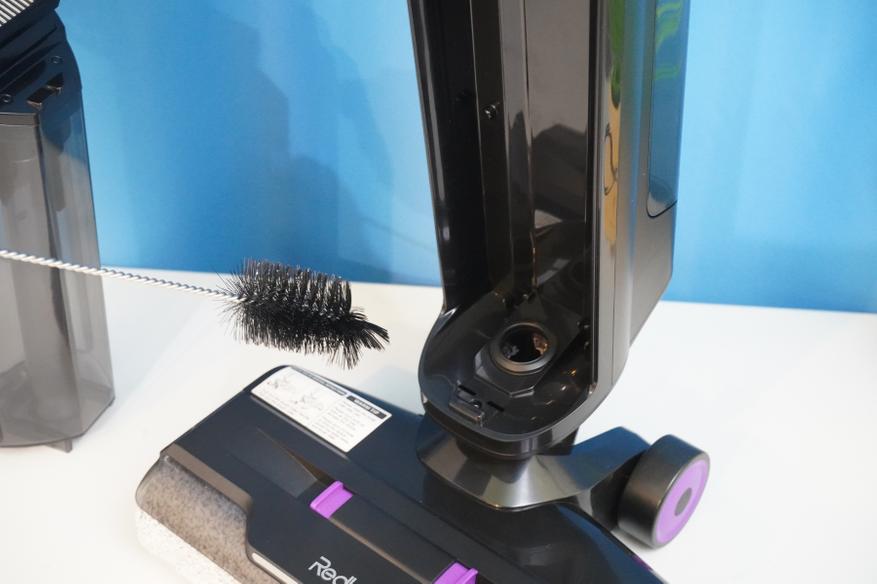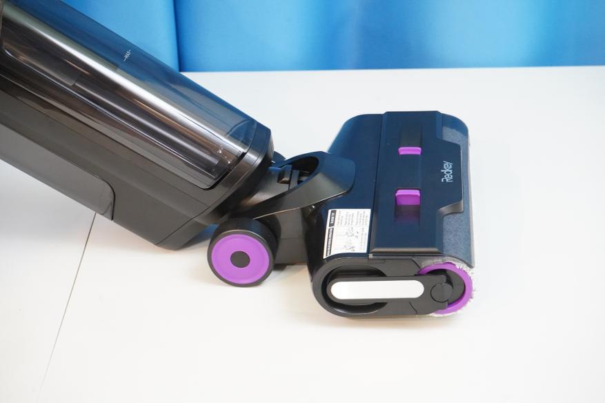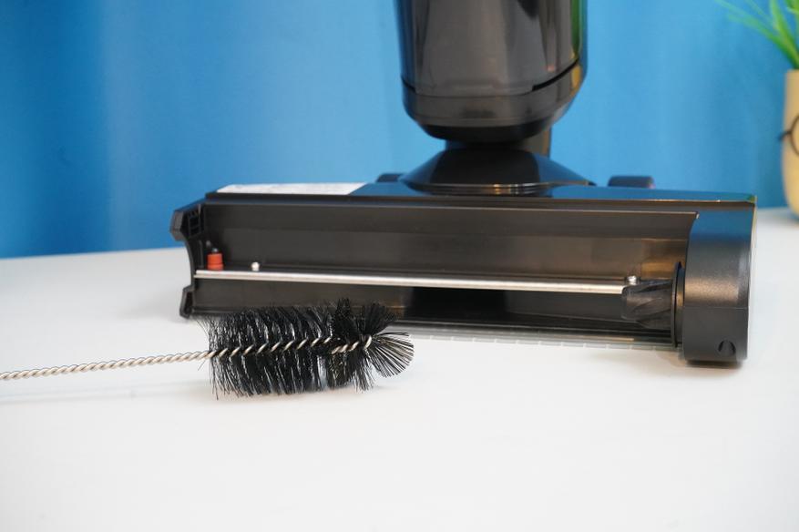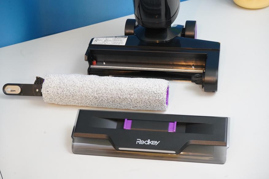 В нижней части корпуса пылесоса расположена щётка для влажной уборки с мягким ворсом. Крышка съемная, внутри находится механизм, который приводит в движение роликовую щетку, форсунки для подачи чистой воды (смачивание ролика и смывание пыли), металлический и резиновый скребки для отжима и сбора воды. Ролик легко снимается (достаточно потянуть в сторону), а в комплекте есть запасной ролик. Благодаря высокой скорости вращения пылесос Redkey W15 справляется даже с засохшими пятнами.