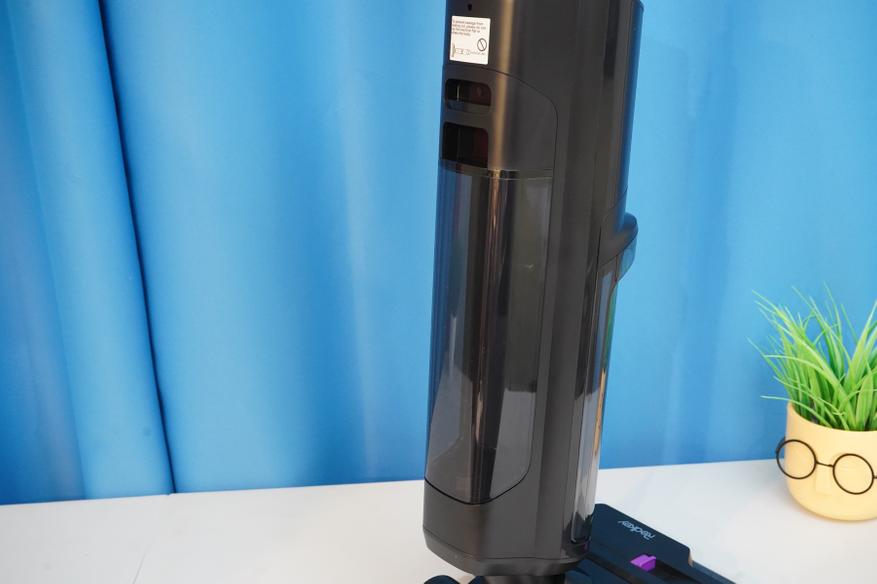 Второй контейнер расположен в передней части корпуса, объёмный — включает систему фильтрации, и сделан из полупрозрачного пластика. Внутри имеется датчик переполнения (для индикации на дисплее), но контролировать уровень грязной воды можно и визуально. В этот контейнер собирается грязная вода при работе, туда же попадает мелкий мусор, шерсть и так далее. Контейнер оснащён аквафильтром, HEPA-13 фильтром, а его рабочий объем составляет 600 мл.