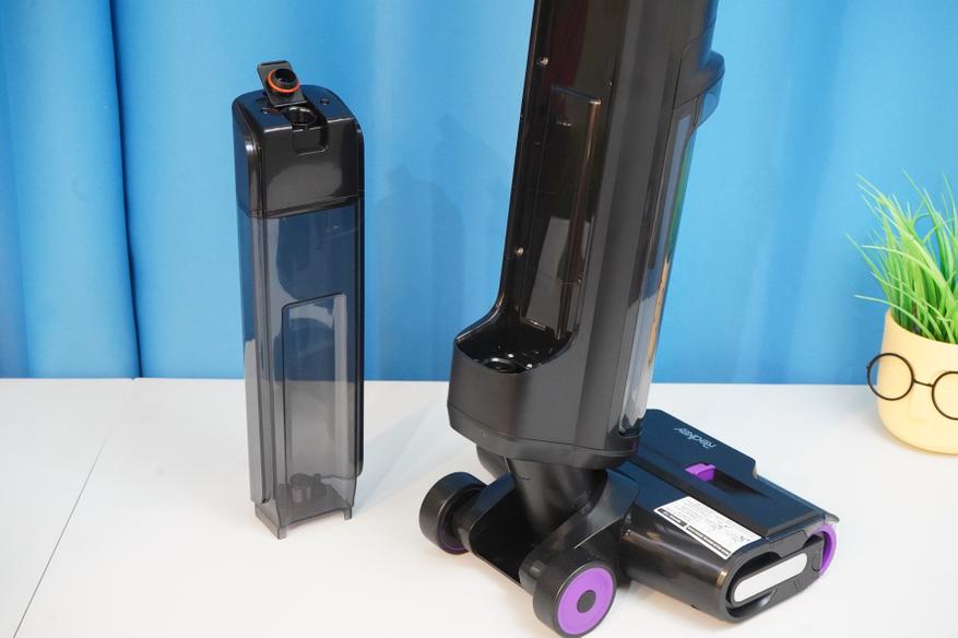 Как я уже сказал выше, в корпусе пылесоса предусмотрена пара съемных контейнеров, предназначенных для расхода и сбора воды во время работы. Первый контейнер расположен позади корпуса, узкий, с крышкой и предназначен для наполнения чистой водой. Можно добавить в контейнер специальную жидкость для лучшего результата. Единственный момент — не используйте жидкости, которые дают обильную пену. Объем приличный — чуть меньше литра (910 мл), такого объема уверенно хватает практически для уборки 150 кв. метров помещения.
