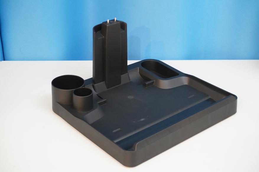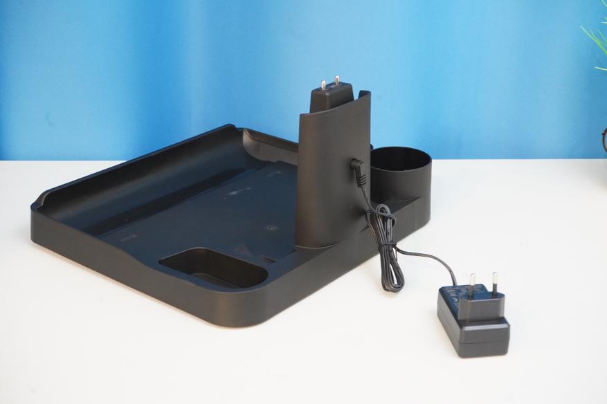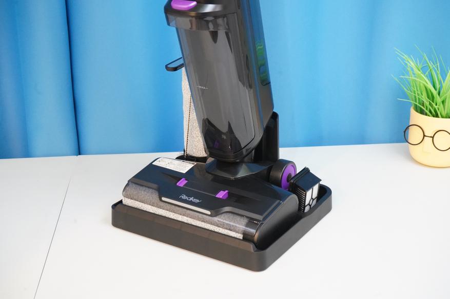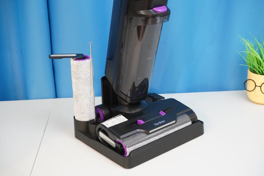 Одно из преимуществ таких моющих пылесосов — это возможность самоочистки на базе. В комплекте предусмотрена станция самоочистки, которая работает не только как зарядная станция, но и служит для мытья ролика в автоматическом режиме, а также для хранения запасного ролика и фильтра в органайзере. После работы пылесос устанавливается на базу — там он заряжается, моется и сушится. После зарядки и сушки пылесос снова готов к работе.