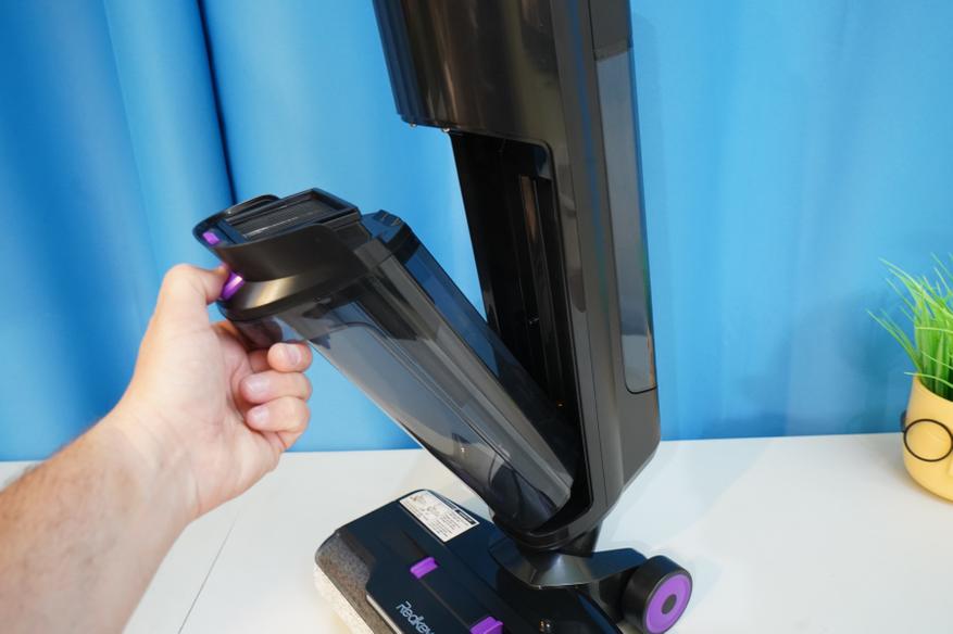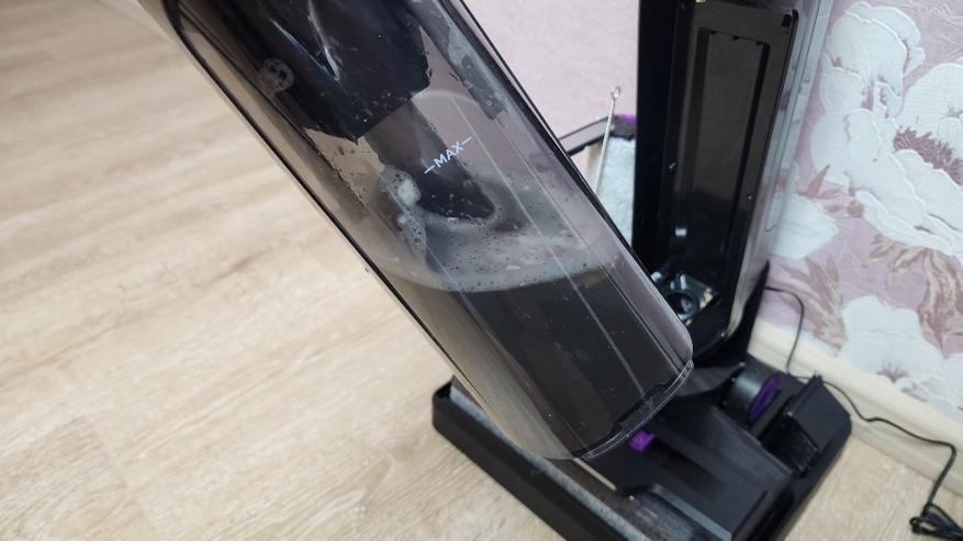 Провели уборку — оставьте немного воды (или добавьте заново) для самоочистки. Самоочистка запускается одной кнопкой при размещении пылесоса на базе. Пылесос самостоятельно промоет и просушит ролик.