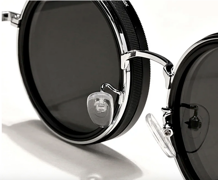 Этот аксессуар сразу привлекает внимание не только формой, но и продуманными деталями. Круглая металлическая оправа с декоративными шорами сбоку находка для тех, кто ценит оригинальность, но не готов жертвовать удобством. Благодаря силиконовым носоупорам и хорошо сбалансированным дужкам модель уверенно держится, не давит и не натирает даже после нескольких часов на улице.