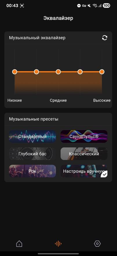 Басы в ней плотные, с хорошей отдачей — это заслуга пассивных излучателей и конструкции корпуса. Они не забивают остальные частоты, а аккуратно дополняют общую картину. Средние частоты звучат естественно, вокал и живые инструменты не теряются и не сливаются. Высокие частоты не слишком звонкие, но и не приглушённые — ровные, без раздражающих резких пиков.