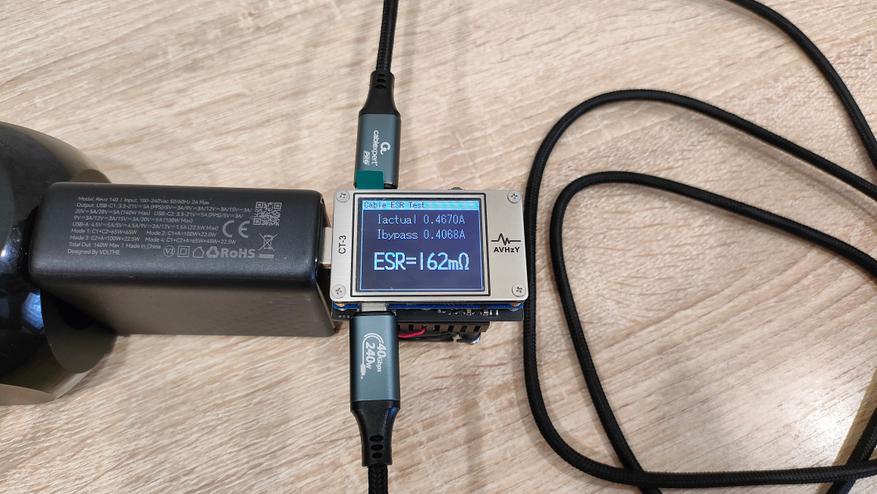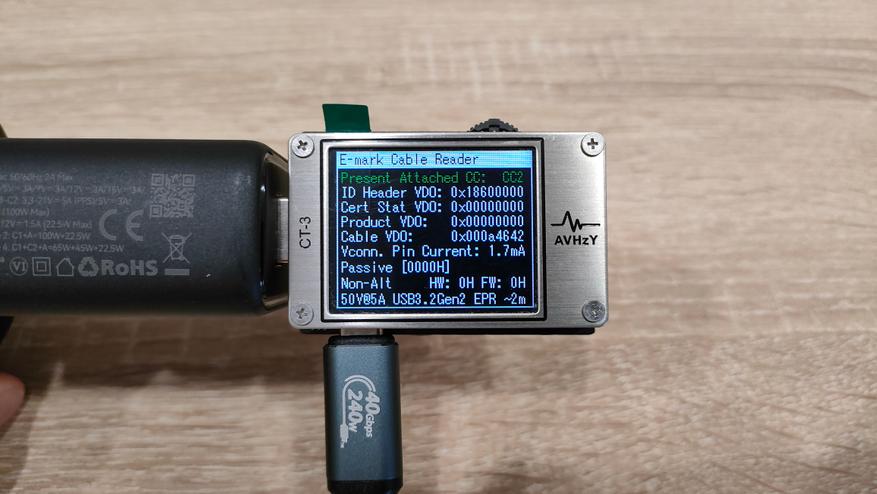 Сразу отправился проверять возможные режимы работы Power Delivery, а также считывание чипа. USB 3.2 gen2, указано, скорее всего, из-за ограниченности тестера, скорее всего, он просто не знает более свежие версии универсальной шины. Сопротивление кабеля 162 мОм, что, я считаю, очень неплохим показателем, тем более на почти двухметровой длине. Нагрузка у тестера позволяет «употребить» 100 Вт, и с этим все хорошо, каких-либо аномалий не выявлено.