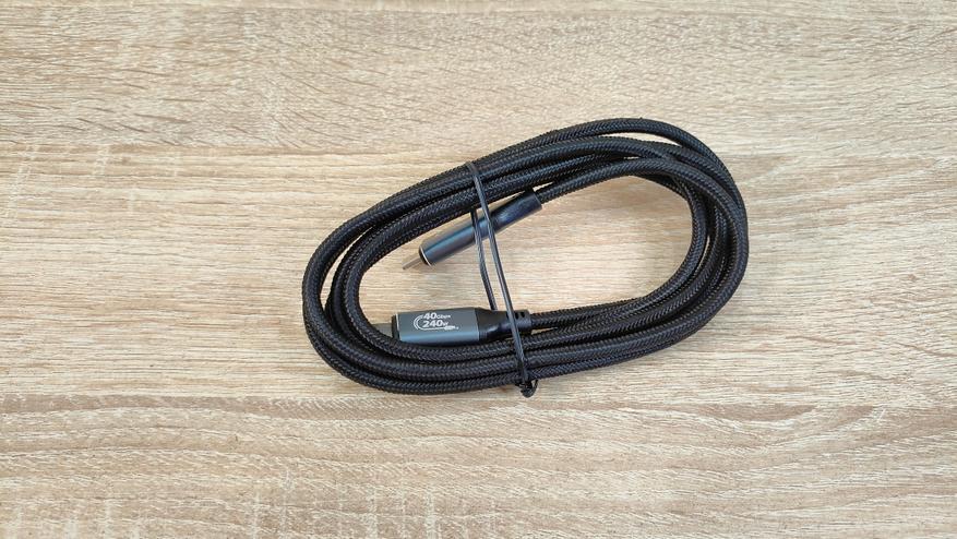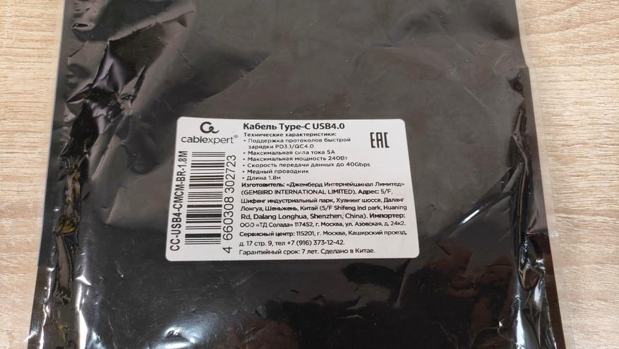 На лицевой стороне перечислены основные фишки данного проводка, но я бы добавил ещё в этот список DP, или USB 4, так как это очень важная характеристика. На обороте, к слову сказать, это указано, на неклейке. Комплект поставки минимальный — только кабель.