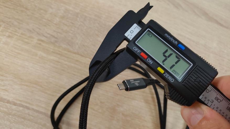 Кабель имеет длину 1.8 м от края до края, тканевую оплётку, среднюю жёсткость. Внешний диаметр у него 4,7 мм, что вполне очень даже неплохо для современного и «способного» провода. С обеих сторон у него естественно USB Type-C с металлической оболочкой, никаких Type-A или, тем более, Type-B, экранов и прочей мишуры также нет. Вполне неплохая возможность сделать универсальный кабель невысокой стоимости.