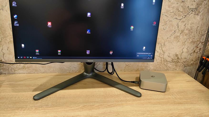 Но подобные кабели берут не только для зарядки, например, ноутбуков, с возможностью, когда это необходимо, передавать информацию. А еще этим кабелем можно подключить мини-ПК, тем самым решить несколько задач: запитать его, передавать видео и аудио, подключить (если он есть) USB-хаб в мониторе. В данном случае, я подключил всего один проводок к монитору, получил работающий миник, изображение на экране, подключенный комплект мышь+клавиатура, а также подключенную гарнитуру к монитору.