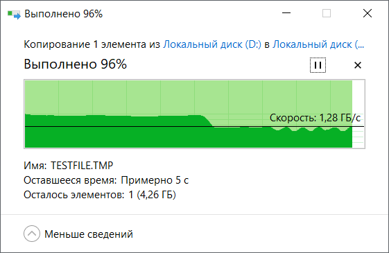 Для тестирования решил передать файл объемом 120 Гб. Использовал бокс Orico с USB4 с 40 Гб/с, при помощи кабеля. Файл переместился примерно за минуту, что соответствует скорости передачи 2 ГБ/с, выше не поднялось из-за ограничений встроенного накопителя, но это не так важно, важно, что кабель смог обеспечить подключение с высокой скоростью выше 20 Гб/с, что возможно только при поддержке режимов 40 Гб/с и выше.