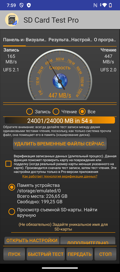 Тесты накопителя показали скорость записи в 165 MB/s, а чтение 447 MB/s