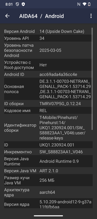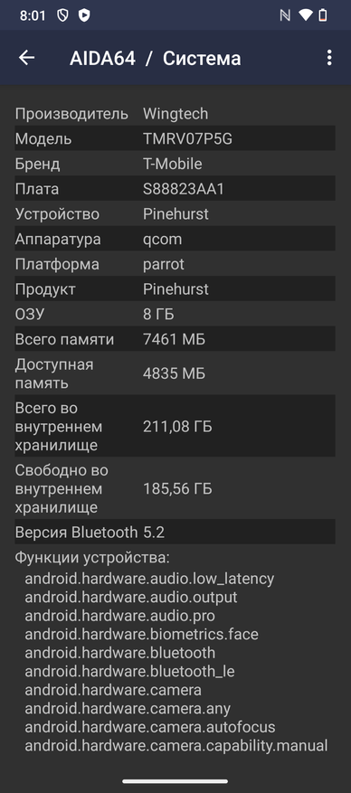 Сердцем Revvl 7 Pro 5G является 8-ядерный Qualcomm SM6450 Snapdragon 6 Gen 1 с графикой Adreno 710. Изготовлен чип по 4-нанометровому техпроцессу, он имеет 4 ядра Cortex-A78 на 2200 МГц и 4 ядра Cortex-A55 на 1800 МГц. Смартфон имеет 8 ГБ оперативной памяти и 256 ГБ — постоянной, которые могут быть расширено до 2 ТБ за счет microSD карточки. Скриншоты AIDA64: