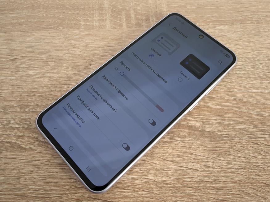 Смартфон получил 6,7-дюймовый SuperAMOLED-экран с разрешением 2340x1080 и частотой 120 Гц. Дисплей обладает сочной и гибкой настраиваемой картинкой, да и к максимальной яркости претензий нет, осенним солнечным днём её спокойно хватает. К минусам можно отнести не самые высокие углы обзора (при явном отклонении дисплей начинает переливаться зелёным и фиолетовым), а также типичное для Samsung мерцание на низкой яркости. Во флагманской S-серии с этим недугом уже начали бороться, а вот A-шки продолжают вредить глазам своей ШИМ. Есть поддержка Always on Display, но нет HDR. Стекло экрано имеет хорошее олеофобное покрытие и дополнительно защищено маленьким бортиком. Стекло абсолютно плоское, так что проблем с установкой плёнок возникнуть не должно.