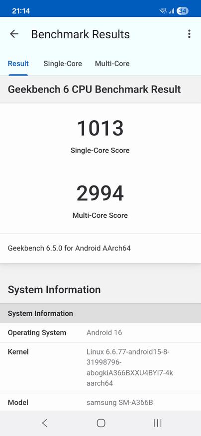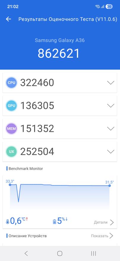 Samsung Galaxy A36 стал первым за десять лет смартфоном серии A3, получившим процессор от Qualcomm: обычно подобные аппараты или донашивали прошлогодние чипы Exynos, или работали на базе средне-бюджетных Mediatek. Впрочем, Snapdragon 6 Gen 3 по характеристикам очень близок к популярному чипсету Dimensity 7300, что построен на том же наборе ядер и имеет идентичную производительность. К скорости работы претензий нет, аппарат с легкостью справляется с повседневными задачами и лишь изредка демонстрирует лёгкую «задумчивость». Также процессоры Snapdragon славятся хорошим поведением в играх, что показывает и Galaxy A36: в PUBG мы можем играть на настройке «максимум» со стабильными 60 FPS. Под нагрузкой корпус телефона практически не нагревается, к троттлингу платформа также устойчива. Аппарат выпускается в версиях 6/128, 8/128, 8/256 и 12/256. Чаще всего в продаже встречаются варианты с 8 ГБ оперативки.