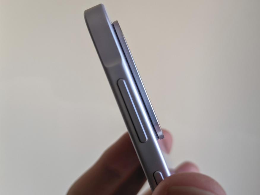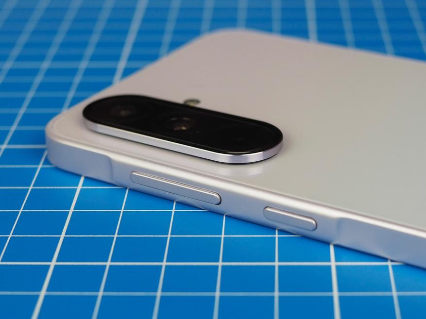 Качество сборки в целом хорошее, однако механические кнопки немного люфтят, а между камерой и спинкой виднеется широкий зазор (в него можно просунуть ноготь), который через некоторое время обязательно забьётся пылью. Спинка и дисплей прикрыты защитным стеклом Gorilla Glass Victus+, а боковины сделаны из матового пластика. Носить телефон лучше в чехле, так как грани получились довольно острыми, а крышка — скользкой. По традиции, корпус имеет защиту от пыли и воды по стандарту IP67.