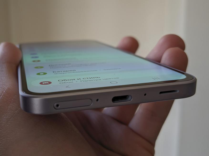 Снизу можно увидеть разъём USB-C, динамик, основной микрофон и слот для двух NanoSIM. Сверху расположился микрофон шумоподавления, а справа — традиционный набор кнопок. Дополнительные отверстия на торцах нужны для компенсации давления при погружении в воду. Сканер отпечатков пальцев находится под экраном; с точностью распознавания у него всё хорошо, а вот скорость срабатывания могла бы быть и выше.
