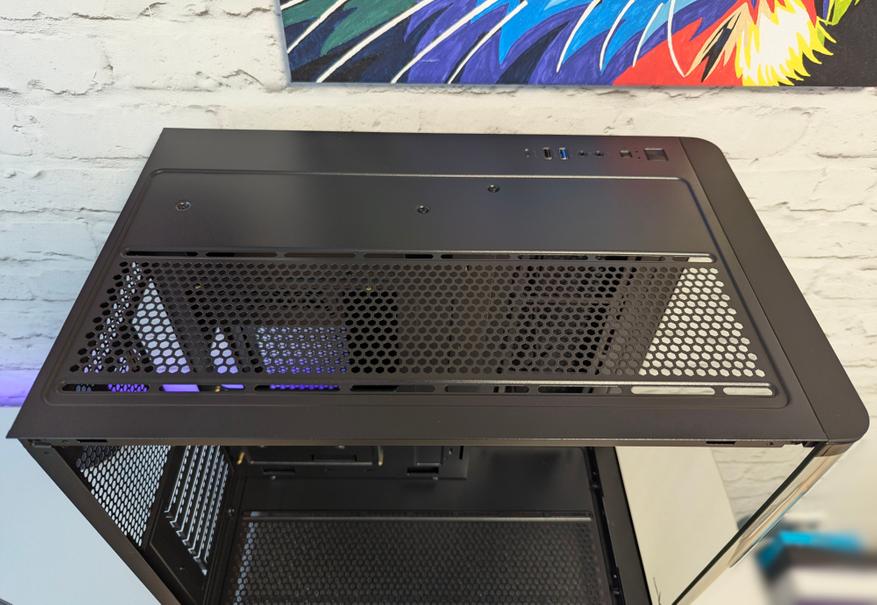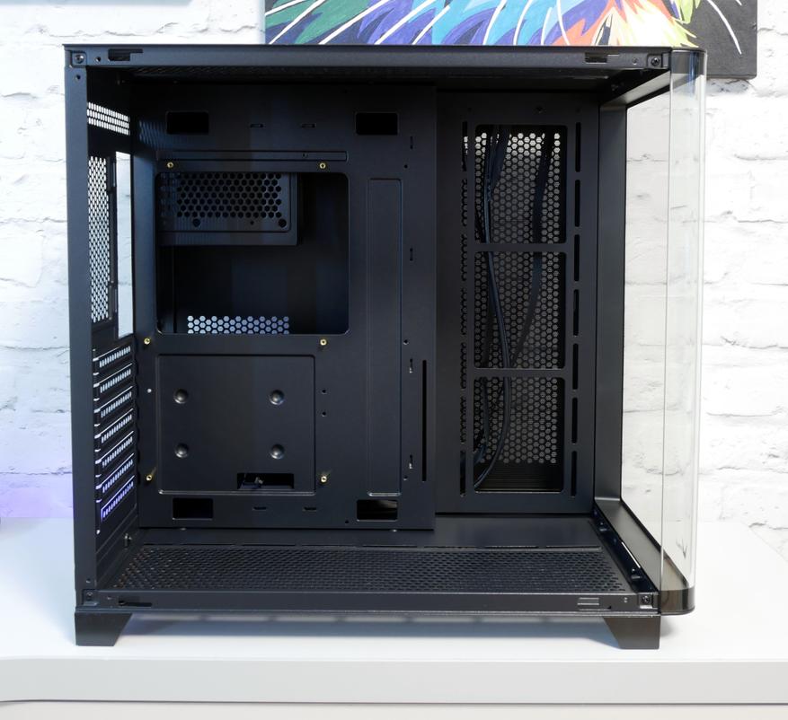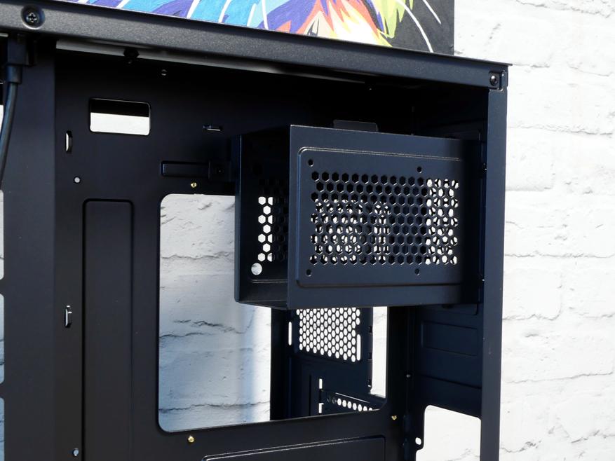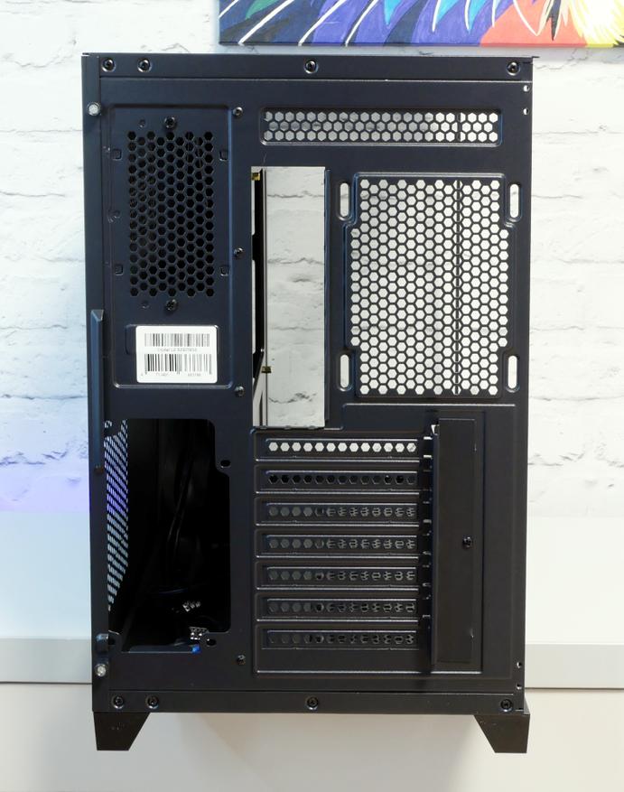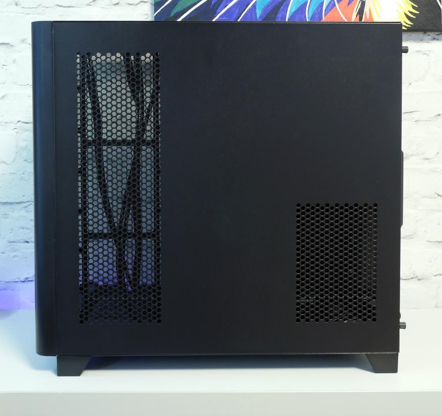 Боковое стекло крепится на четырех фиксаторах, по два сверху и снизу, и фиксируется двумя простыми винтами. Задняя стенка получила перфорацию напротив вентиляторов и блока питания: к слову, фильтра у БП нет. Дверца держится тремя ключами спереди и на два винта сзади. Это привычный, простой и бюджетный способ.