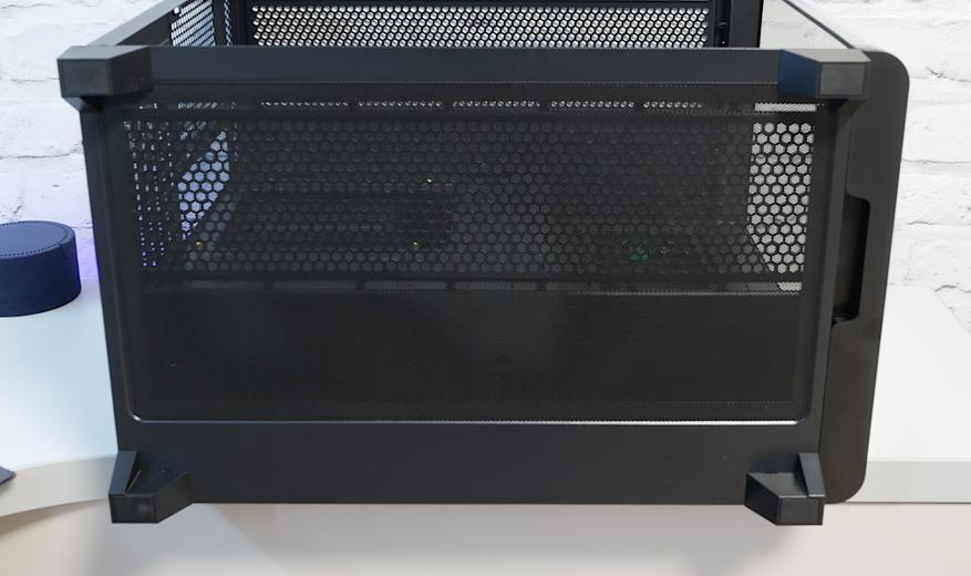 На основании стандартные ножки с мягким наполнителем от вибрации. А вот ручка спереди еще раз напоминает о том, что переднее стекло можно снять. Но сделать это очень сложно, а само к раме оно крепится двухсторонним прозрачным скотчем. Кстати кажется здесь достаточно места для крепления трёх вентиляторов 140 мм.