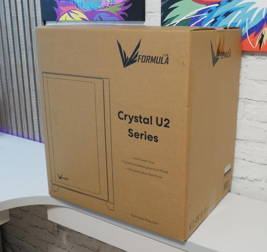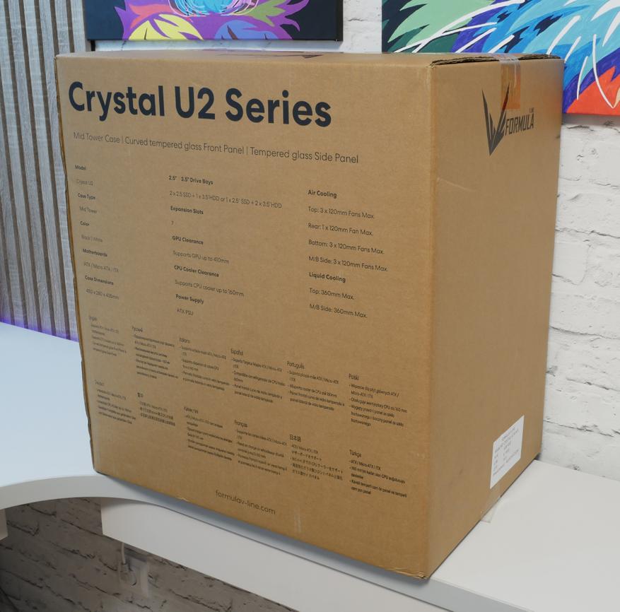Корпус Formula V Line Crystal U2 поставляется в большой картонной коробке с обычной полиграфией. Характеристики указаны прямиком сверху. Что оказалось неудобным — отсутствие простых ручек для переноски, хотя целиком упаковка вместе с кейсом оказались не такими уж и тяжелыми, но вырезы для переноски, кажется, дело обыденным и простым.