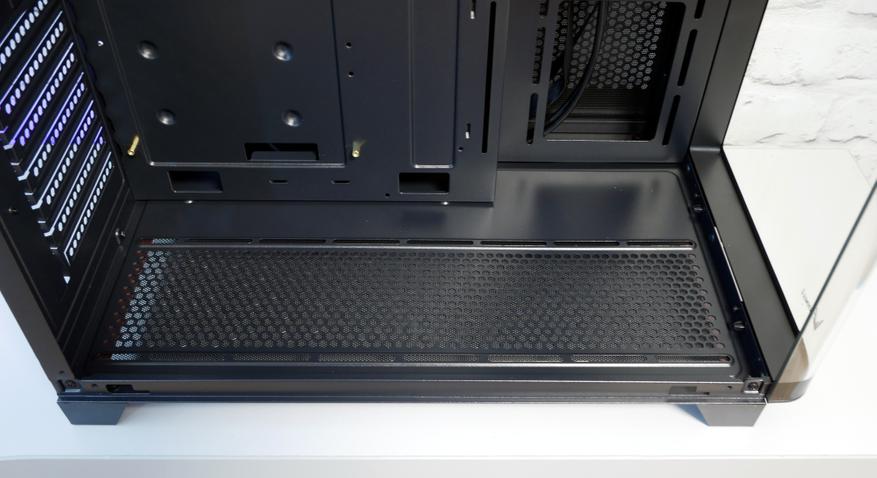 Что очень важно и примечательно — это отсек сбоку для систем охлаждения. Он имеет глубину 50 мм, прибавим высоту латунных стоек 7 мм под материнскую плату, и значит, сюда можно установить классическую СЖО с толщиной радиатора 27-30 мм + вентиляторы 25 мм, и они не будут упираться в длинную видеокарту. Подобный изъян я ранее встречал на PowerCase Vision Micro M. Высота отсека равна ~405 мм.