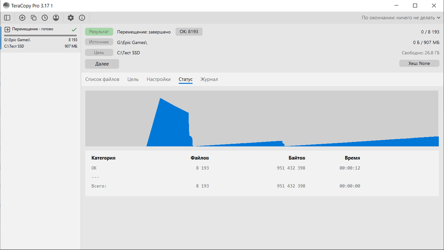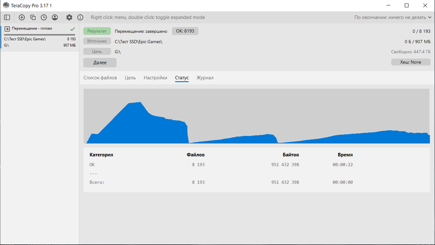 Второй сценарий — перенос большого количества мелких файлов. В этом случае перемещалась папка с играми Epic Games, всего 8193 объекта общим объемом около 907 МБ. Операция заняла 22 секунды, средняя скорость составила примерно 40 МБ/с. График здесь выглядит иначе: в начале скорость заметно выше, затем идет спад, после чего работа продолжается в более спокойном режиме. Это типичное поведение при большом количестве файлов, когда накладные расходы файловой системы начинают играть заметную роль.