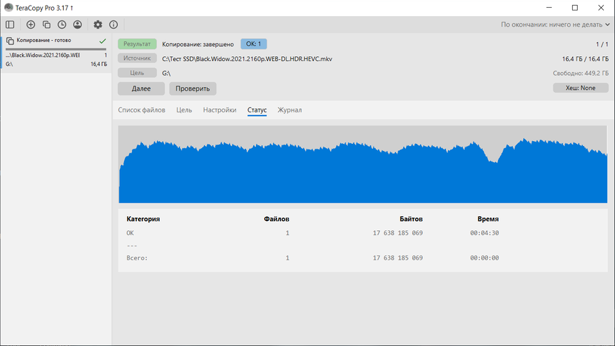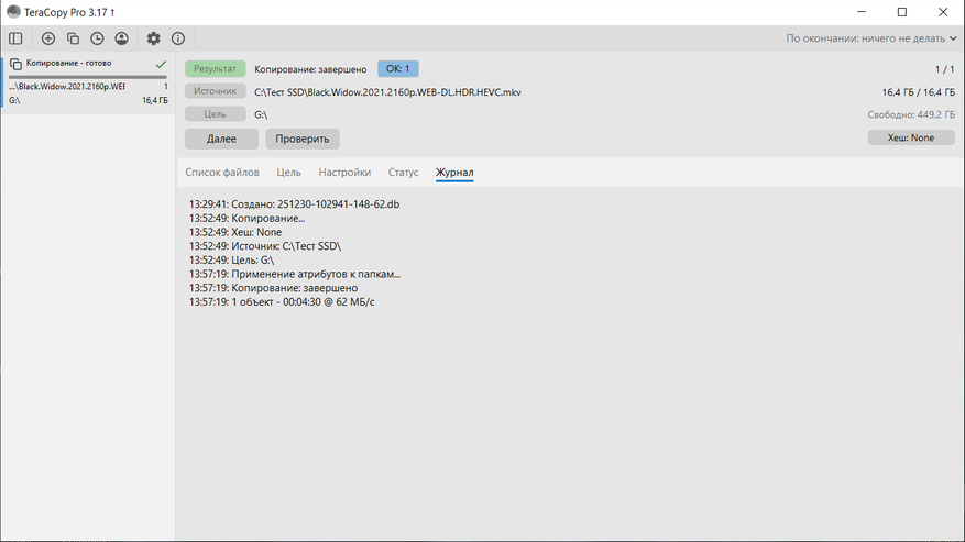 Сначала копирование одного крупного файла. Видео размером 16.4 ГБ было перенесено на внешний SSD за 4 минуты 30 секунд. В журнале фиксируется средняя скорость около 62 МБ/с. Если смотреть на график, видно, что скорость держится достаточно ровно, без резких провалов и обрывов. Кривая плотная, с небольшими колебаниями, но без характерной «пилы». Это хорошо укладывается в картину, которую уже показывала AIDA64 при длительной последовательной записи после заполнения кэша.