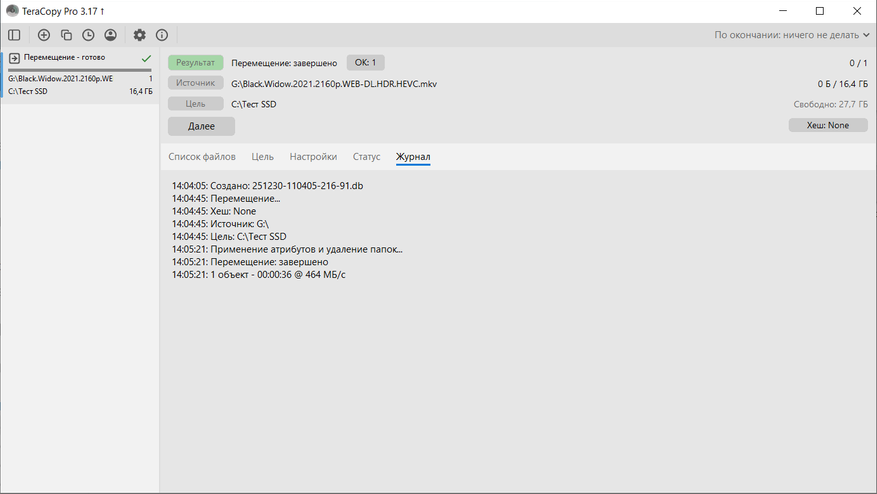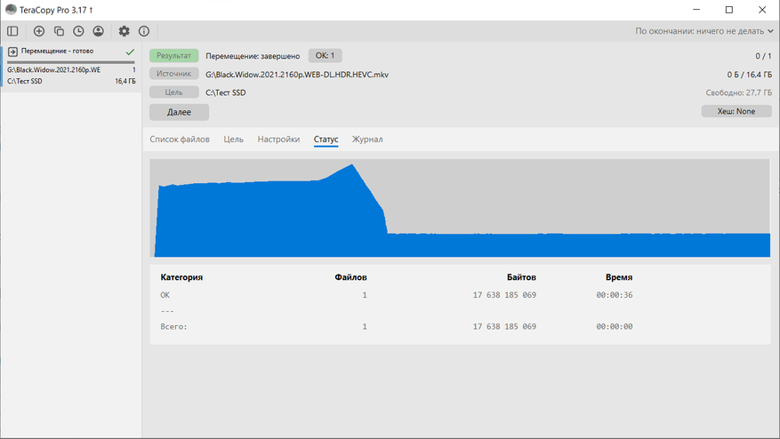 Дальше я развернул сценарий и посмотрел обратную ситуацию — перенос данных уже с внешнего SSD обратно на внутренний NVMe. Этот момент часто упускают, а зря, потому что чтение с внешнего накопителя под нагрузкой может вести себя иначе, чем запись. Начал снова с одного крупного файла. Тот же самый видеофайл объемом 16.4 ГБ был перенесен с ADATA SE880 на внутренний SSD за 36 секунд. В журнале фиксируется средняя скорость около 464 МБ/с. По графику видно характерное поведение: в начале скорость выше, затем она снижается и выходит на устойчивый уровень, без резких провалов и пауз. В отличие от записи, здесь нет длительного «дна» — чтение выглядит более ровным.