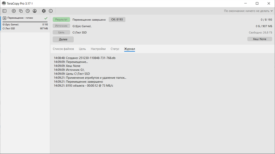 Затем повторил тест с папкой мелких файлов. Перемещалась та же директория Epic Games, 8193 объекта общим объемом около 907 МБ. На этот раз операция заняла 12 секунд, средняя скорость составила примерно 73 МБ/с. График при этом выглядит компактнее и динамичнее, чем при копировании на внешний диск. Просадка есть, но она короче по времени и менее выраженная.