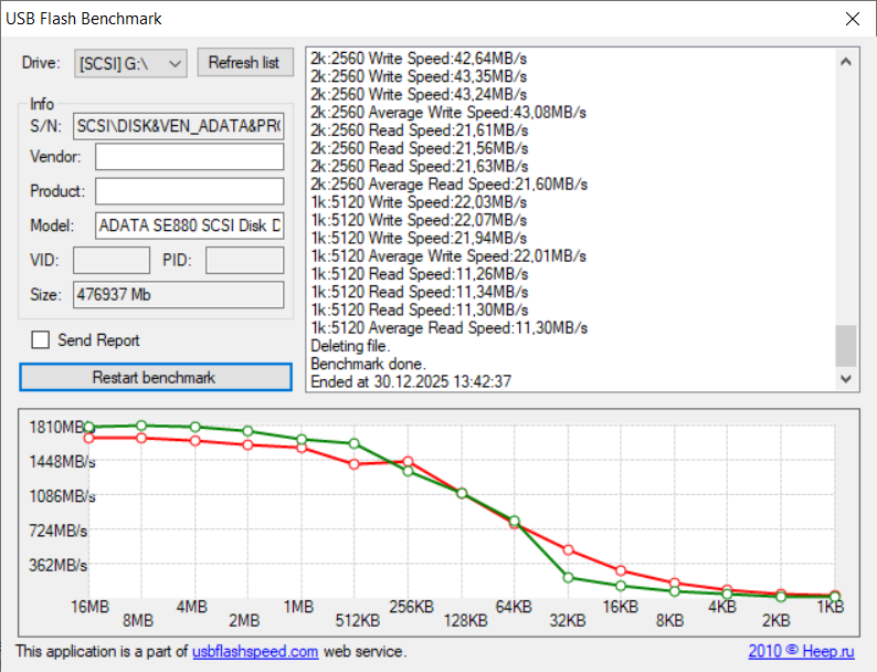 USB Flash Benchmark добавляет еще один ракурс, здесь уже хорошо видно, как накопитель ведет себя при последовательной работе с блоками разного размера. На крупных блоках картина близка к тому, что показывали предыдущие тесты. При размерах от нескольких мегабайт скорость чтения держится в районе 1.7-1.8 ГБ/с, запись идет немного ниже, но без резких провалов. Линии на графике идут достаточно ровно, накопитель не дергается и не пытается компенсировать что-то скачками скорости. Это как раз тот сценарий, который ближе всего к копированию больших файлов или архивов. По мере уменьшения размера блока начинается постепенное снижение. В диапазоне 256-128 КБ падение уже заметно, но все еще выглядит логичным и плавным. Ниже, начиная примерно с 64 КБ и дальше, скорость снижается резко. На мелких блоках в 16-8 КБ чтение и запись опускаются до сотен мегабайт в секунду, а при 4-2 КБ значения становятся совсем скромными. Это хорошо видно и по графику, и по текстовому логу теста. Отдельно обращает на себя внимание симметричность поведения. Чтение и запись снижаются примерно одинаково, без явного перекоса в одну сторону. Нет ситуации, когда чтение остается высоким, а запись резко обрывается, или наоборот.