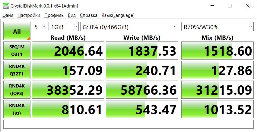В пиковом профиле картина выглядит ожидаемо для USB 3.2 Gen2x2. Последовательное чтение упирается примерно в 2046 МБ/с, запись — около 1837 МБ/с. Это тот случай, когда интерфейс используется почти на пределе, без явных ограничений со стороны накопителя. Смешанный режим R70/W30 показывает порядка 1518 МБ/с, что хорошо отражает поведение при одновременной работе с чтением и записью, например при копировании крупных массивов данных.